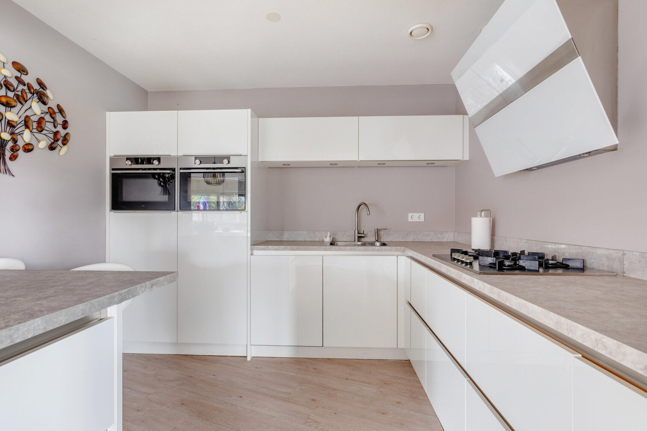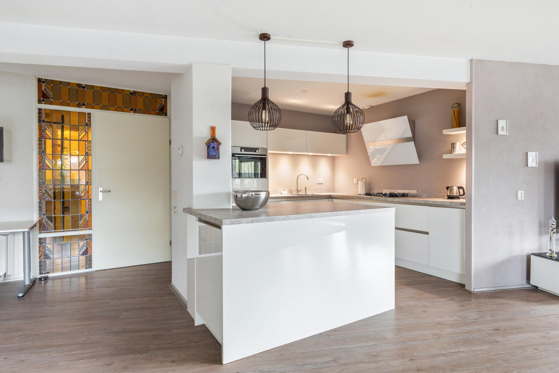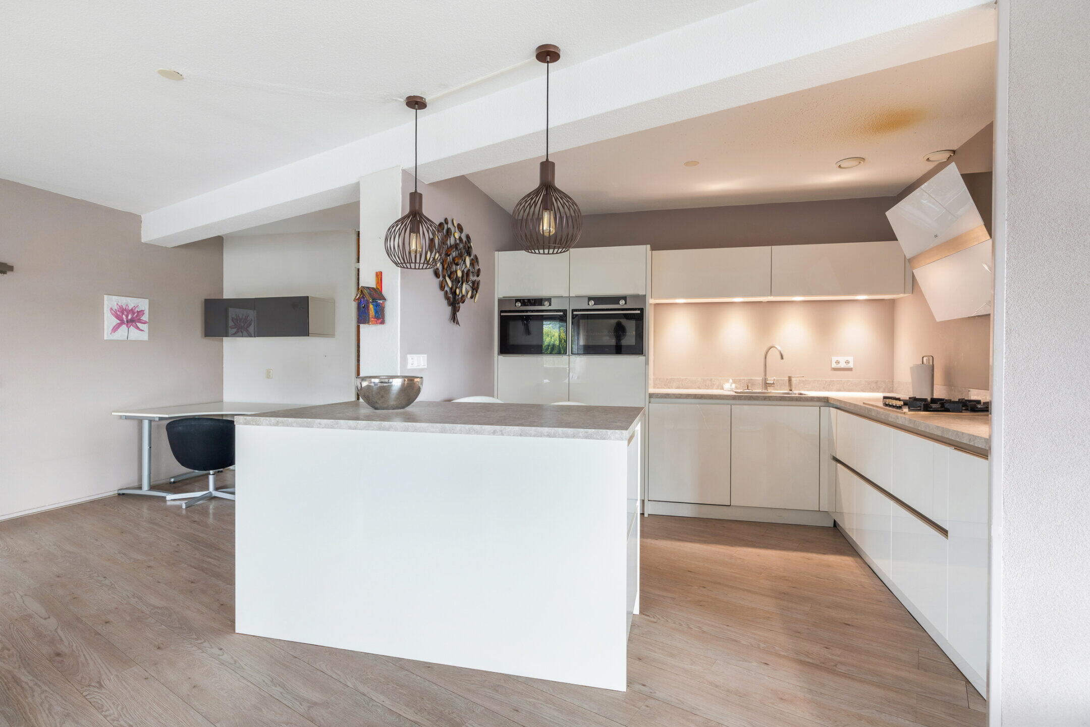 De moderne open keuken (ca. 3.11 x 3.00m) in een hoek- en een eilandopstelling met barfunctie beschikt over voldoende onder- en bovenkastruimte en diverse inbouwapparatuur waaronder een 4-pits gaskookplaat, wandelement afzuigkap, heteluchtoven, combi oven/magnetron, vaatwasser, koelkast, vrieskast (4 laden) en een grote spoelbak. De keuken is afgewerkt met een nette laminaatvloer en beschikt over diverse plafondspots en mechanische afzuiging.