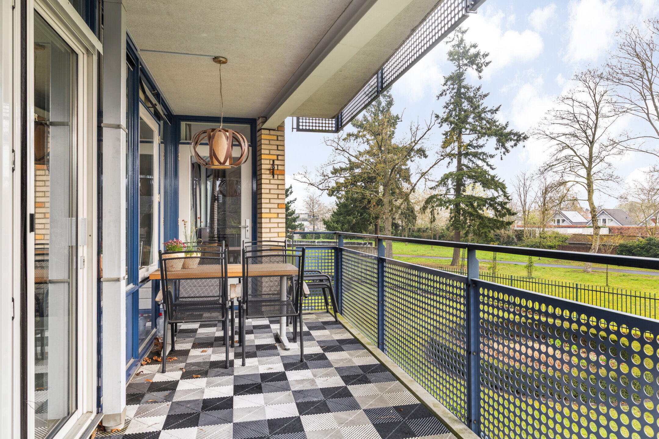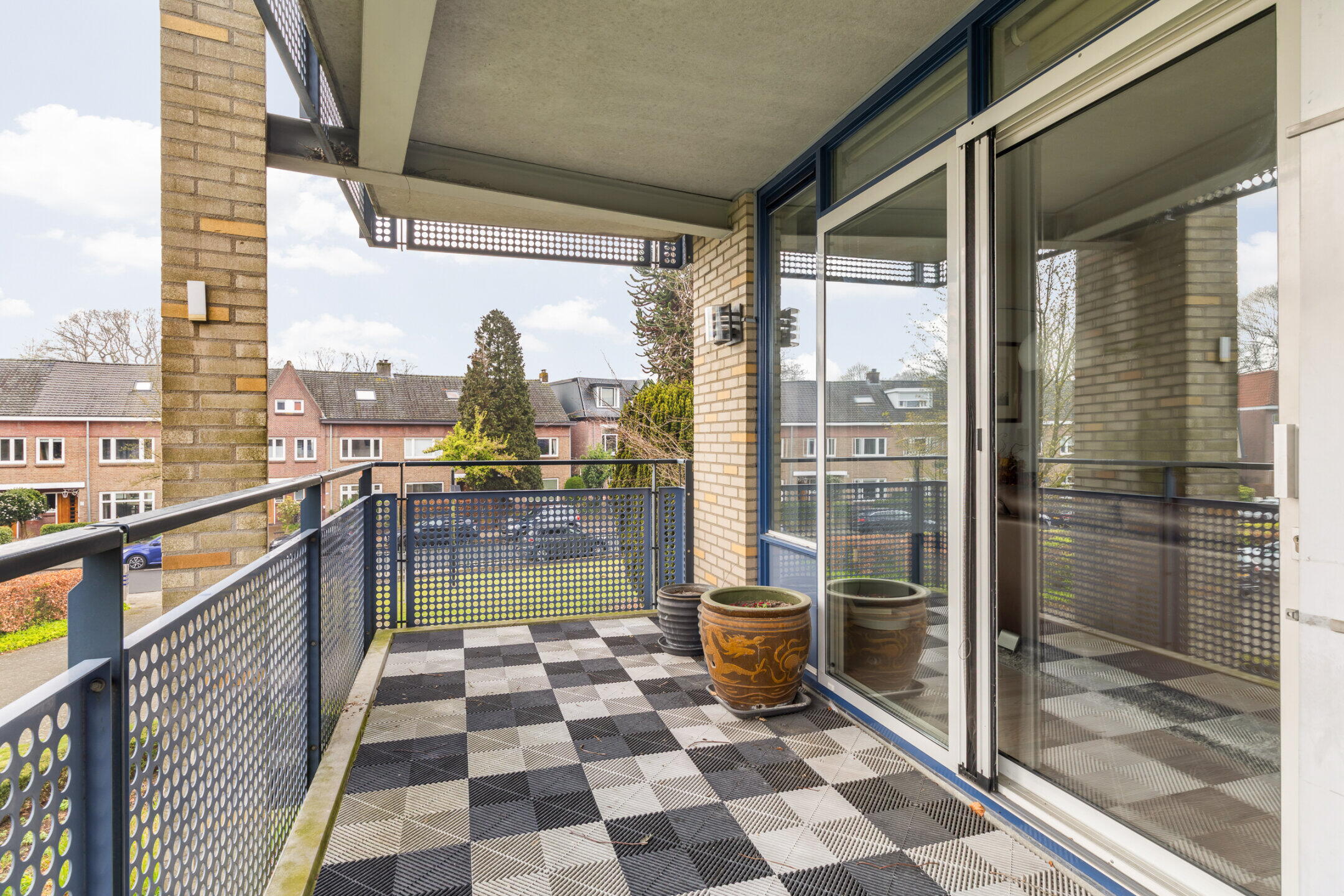 Via een aluminium schuifpui met hor geeft de woonkamer toegang tot het balkon (ca. 6.85 x 2.11m) met een mooi uitzicht over de eigen tuinen bij het complex. Het balkon is gelegen op het oosten en voorzien van kunststof vlondertegels, elektra en verlichting.
