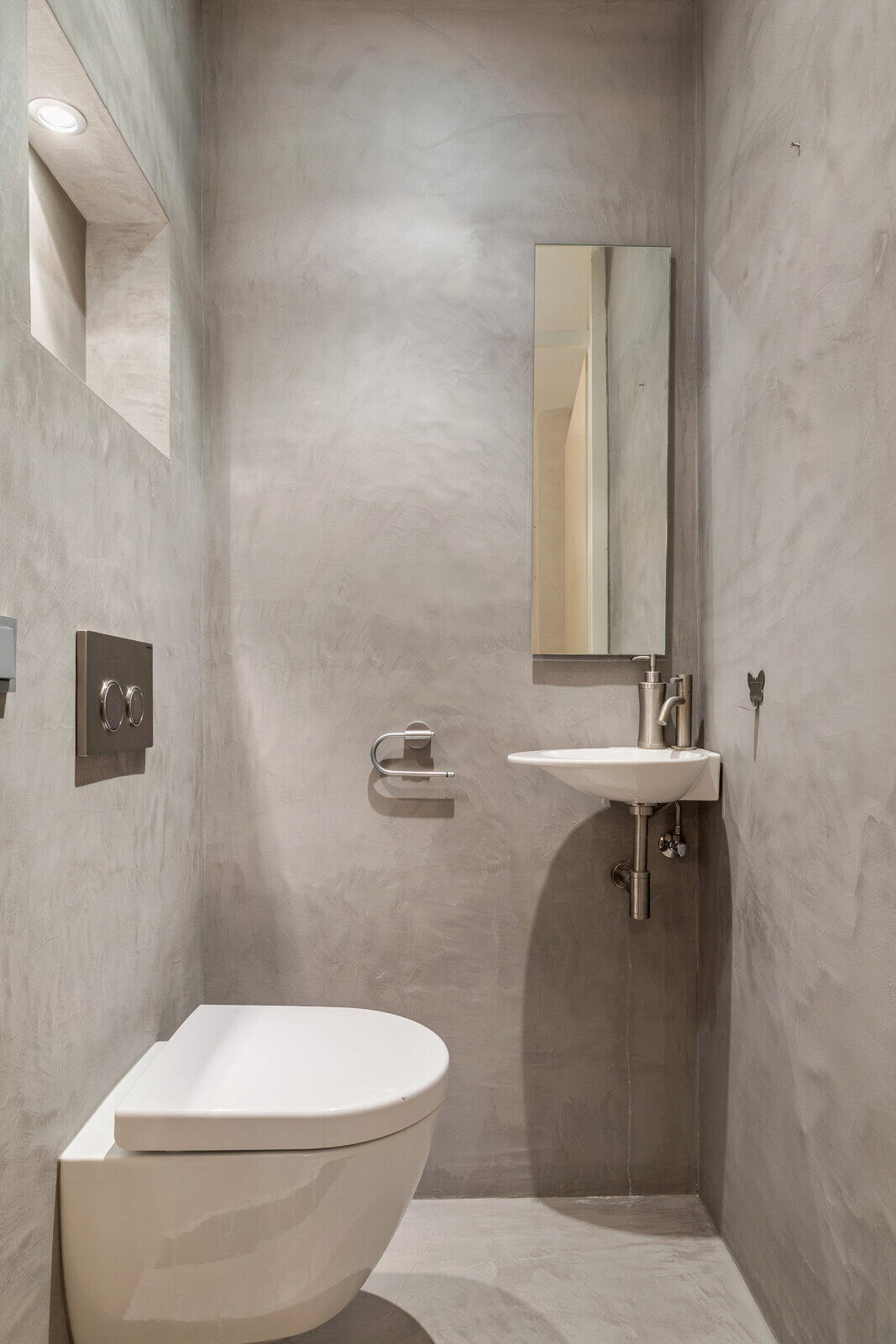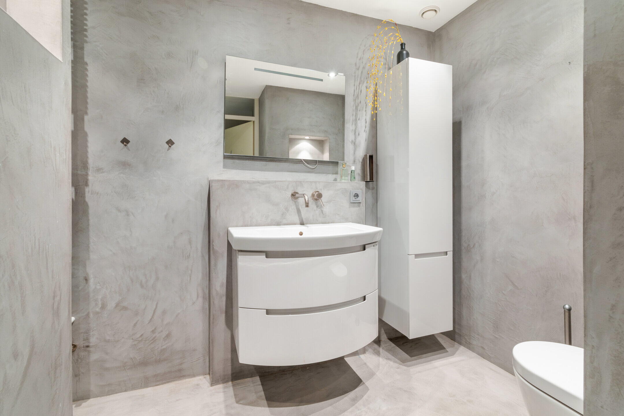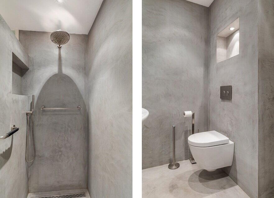 De recent gemoderniseerde badkamer (ca. 3.11 x 2.00m) is voorzien van een royale inloopdouche met hand- en regendouche, handige bergnissen en geïntegreerde bedieningselementen, een brede wastafel in meubel, wandcloset met inbouwreservoir, designradiator, diverse plafondspots en mechanische afzuiging. De badkamer is afgewerkt met een moderne gietvloer en beton ciré wanden.