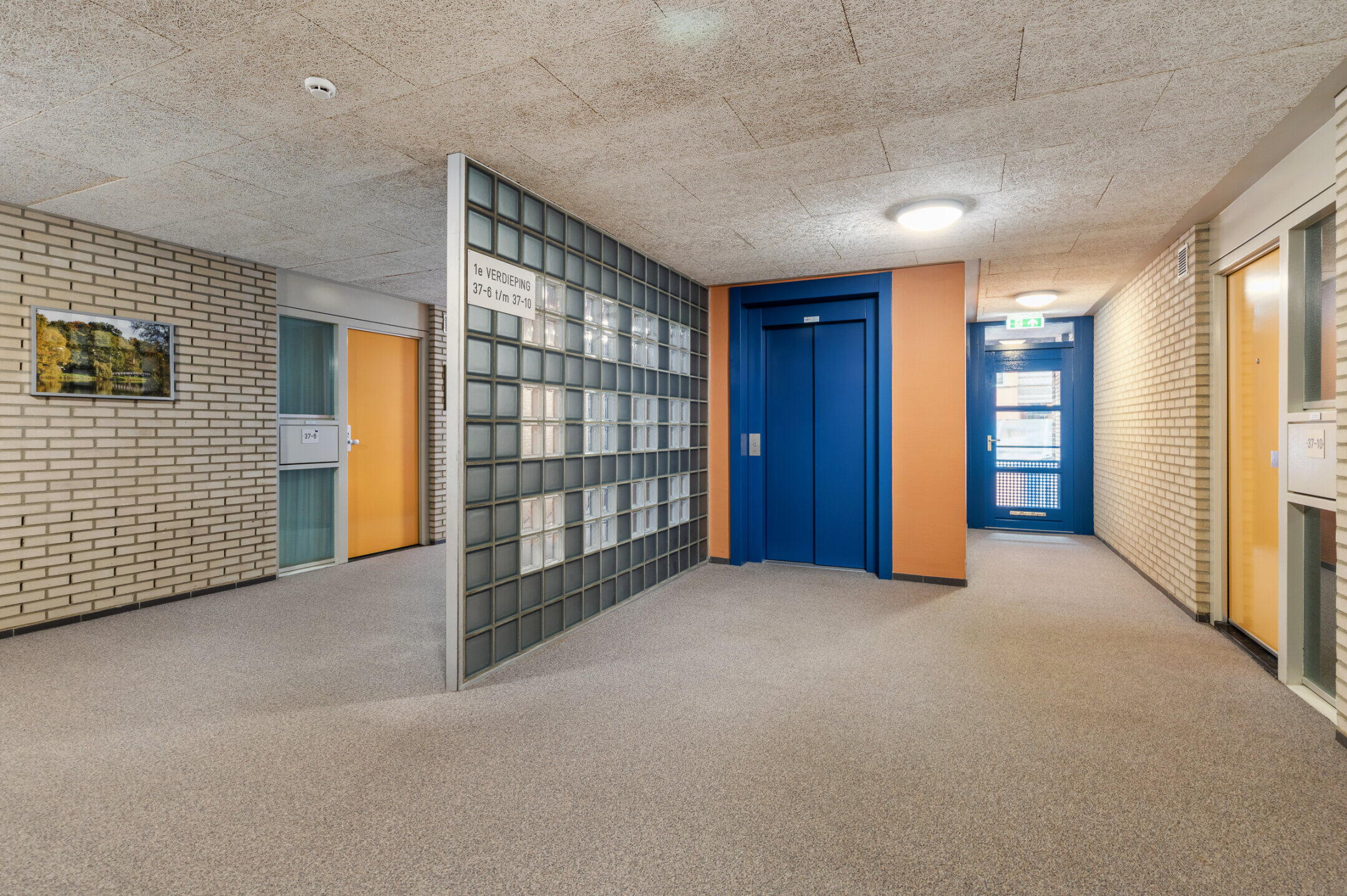 Hal met video-intercom en de brievenbussen, toegang tot de trapopgang en de ruime centrale hal met de liftinstallatie.