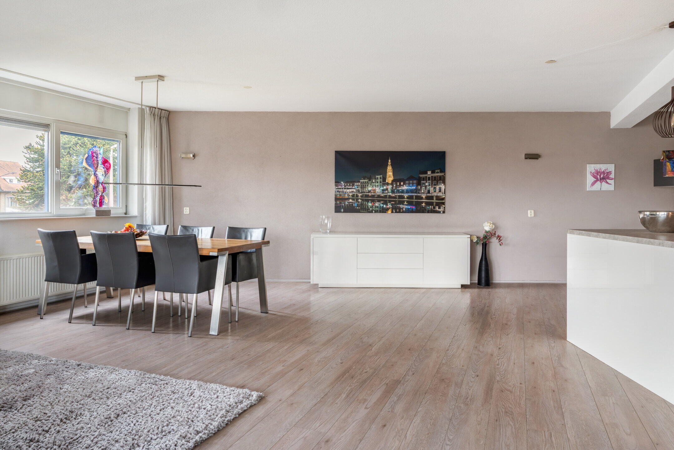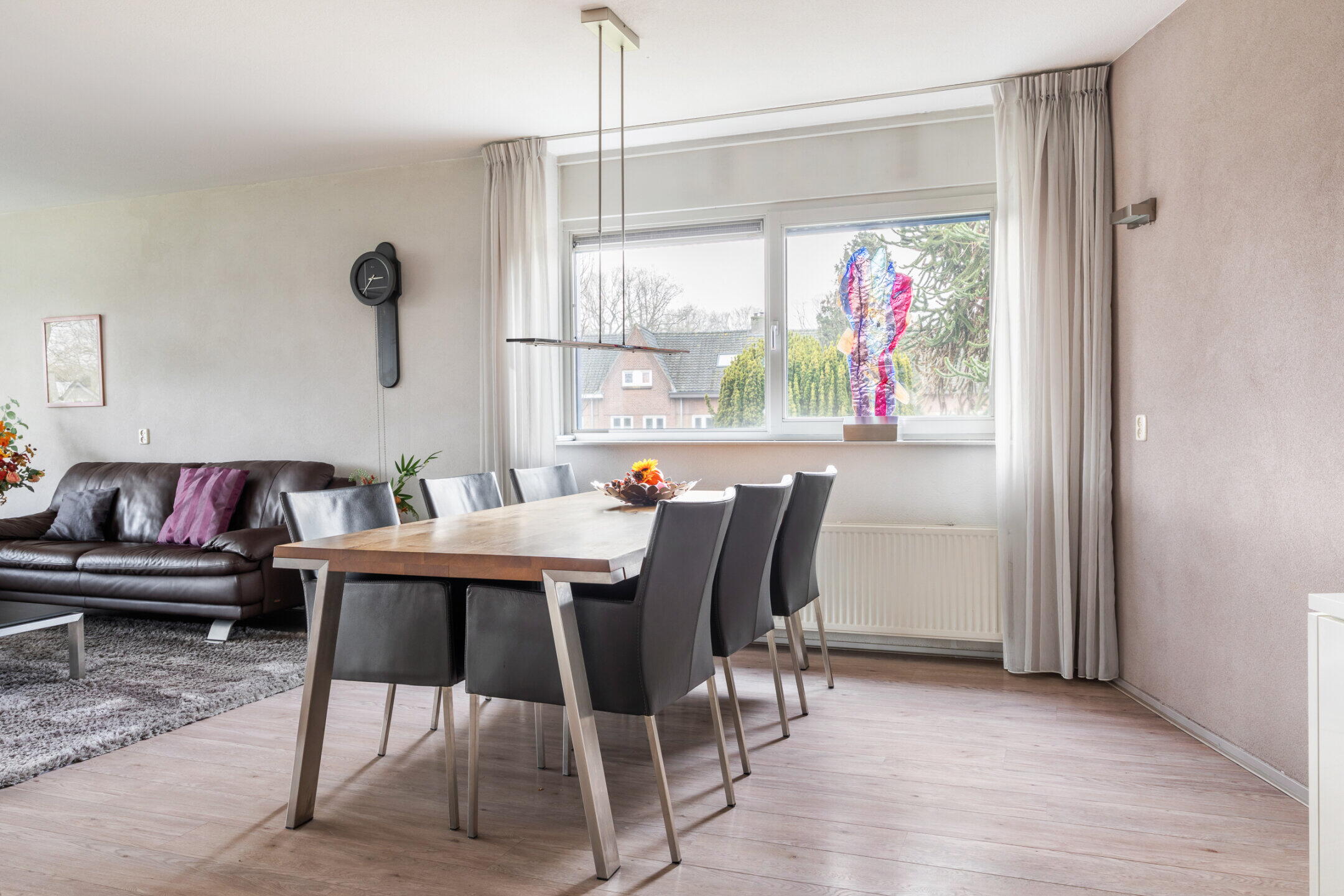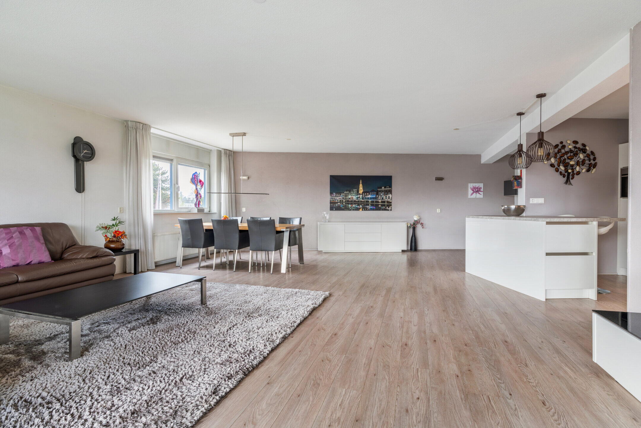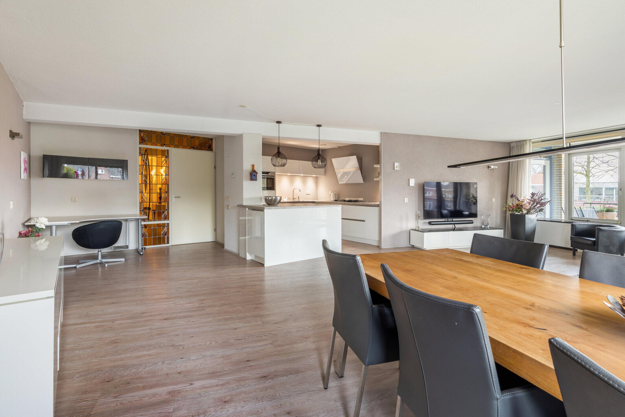 De prachtige woonkamer van maar liefst 67m² is voorzien van een nette laminaat vloerafwerking en kent op ieder moment van de dag een bijzonder fijne lichtinval en een mooi groen uitzicht door de grote raampartijen.
